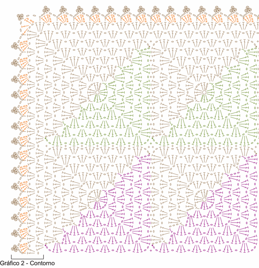Con el hilo de color, haz 3 cadenetas, 2 puntos altos en la cadeneta de base, 1 cadeneta, 3 puntos altos en la siguiente cadeneta de base 3 veces, 1 cadeneta, 3 puntos altos, 2 cadenetas y 3 puntos altos en las 2 cadenetas de la esquina, 1 cadeneta, 3 puntos altos en la siguiente cadeneta de base 3 veces, 1 cadeneta, 3 puntos altos en el medio punto alto de la vuelta anterior, 1 cadeneta y 1 medio punto alto en la 3ª cadeneta inicial de la parte beige.
