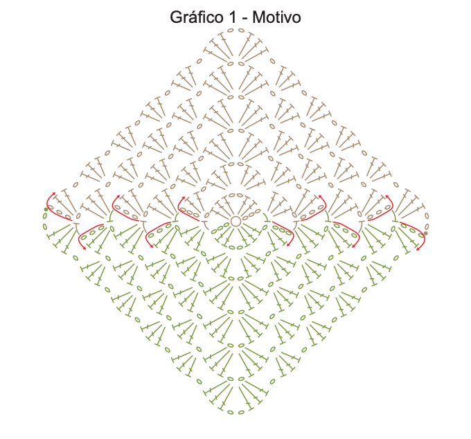 🎨 Vuelta 3: vuelve el motivo al derecho, haz 3 cadenetas, 2 puntos altos en la cadeneta de base, 1 cadeneta, 3 puntos altos en la siguiente cadeneta de base, 1 cadeneta, 3 puntos altos, 2 cadenetas y 3 puntos altos en las 2 cadenetas de la esquina, 1 cadeneta, 3 puntos altos en la siguiente cadeneta de base, 1 cadeneta y 3 puntos altos en el medio punto alto de la vuelta anterior. Deja en espera.