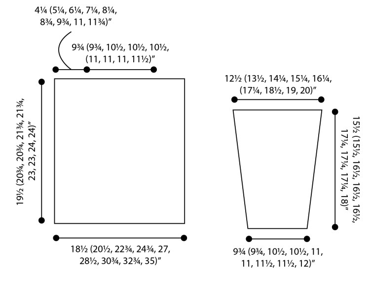 Repetir la Fila de aumento cada 8 (5, 6, 4, 4) (3, 3, 3, 3) filas, 4 (6, 6, 8, 9) (11, 12, 13, 14) veces más