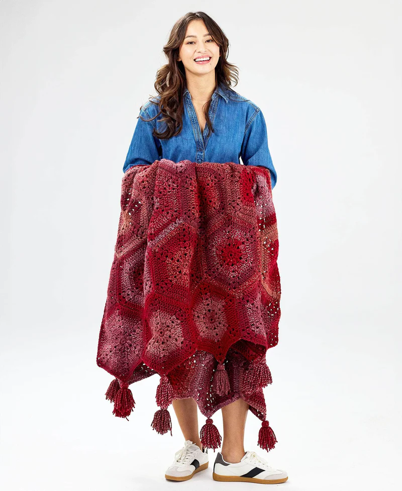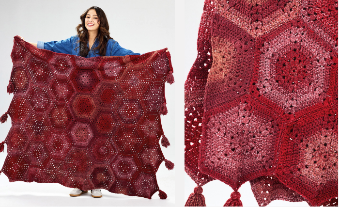 ¡Prepárate para tejer una manta que es una verdadera joya! El Patrón de Manta de Hexágonos a Crochet es una obra de arte visual, con un diseño modular impresionante que combina hexágonos grandes y pequeños en tonos burdeos y rojos, creando un efecto profundo y lujoso. Aunque parezca compleja, tejer esta manta es un desafío gratificante que te permite practicar la unión de motifs y la variación de colores. Es una pieza que se convertirá en la herencia artesanal de tu familia.