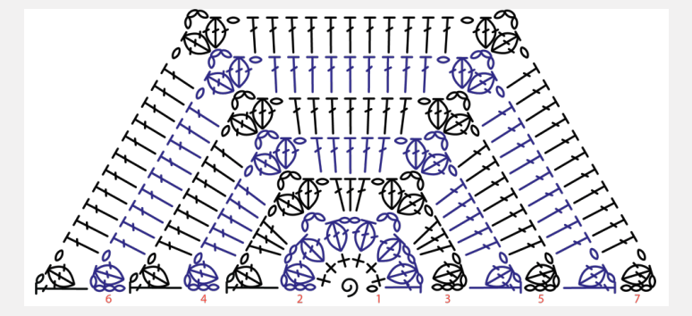 Carrera 4: 4 cad, 3pajc en el esp. de 1 cad, [1 cad, 1 pa en el esp. de 1 cad, 1 pa en cada pa hasta el sig. esp. de 1 cad, 1 pa en el esp. de 1 cad, 1 cad, (3pajc, 3 cad, 3pajc) en el esp. de 3 cad] 2 veces, 1 cad, 1 pa en el esp. de 1 cad, 1 pa en cada pa hasta el sig. esp. de 1 cad, 1 pa en el esp. de 1 cad, 1 cad, [3pajc, 1 cad, pa] en el último pb, girar.