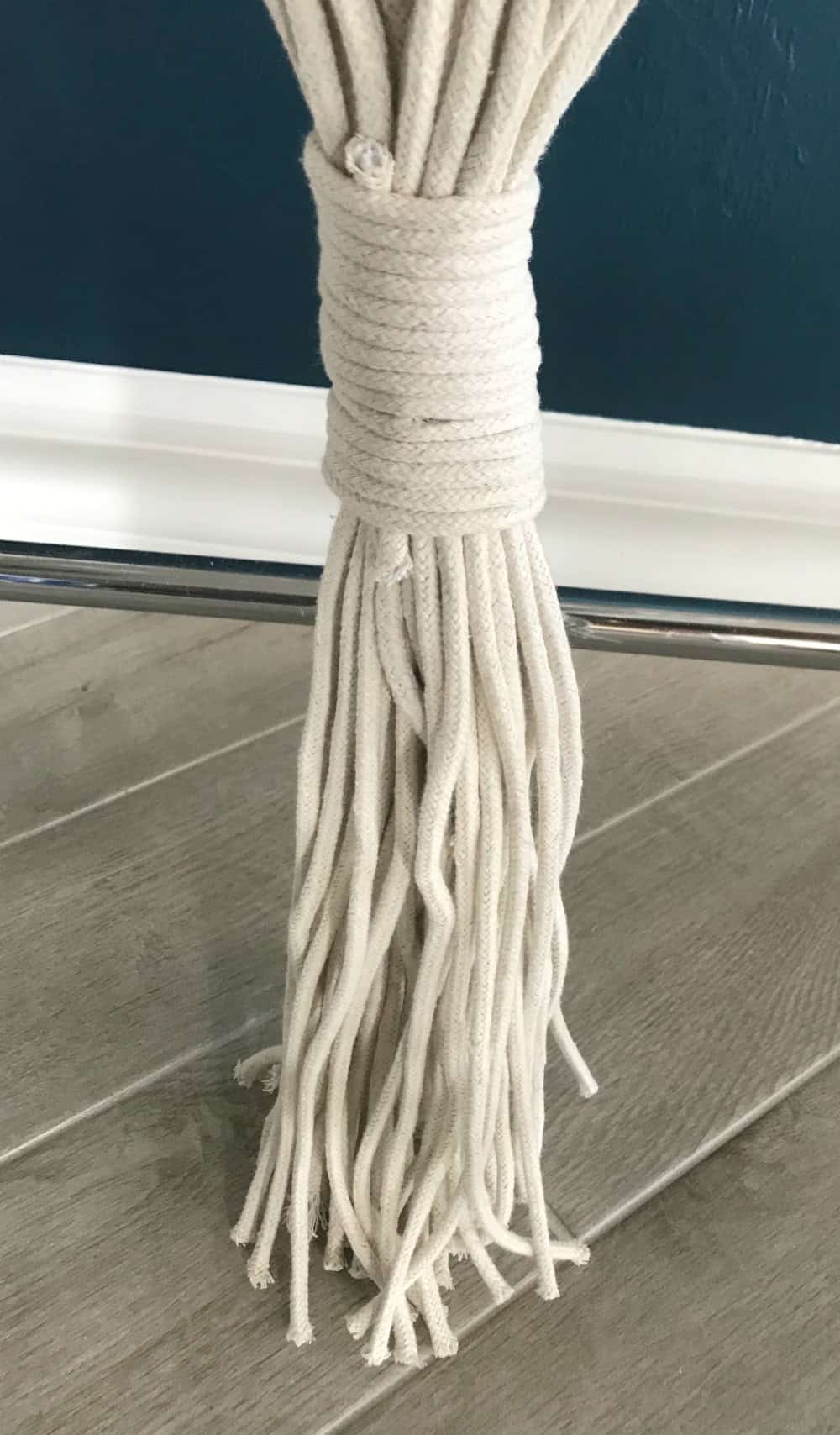 Alrededor de 20″ por debajo de la última fila de nudos, haga un nudo envuelto (usando una cuerda de repuesto). Alrededor de 12″ por debajo de la parte inferior del nudo envuelto, corte los cables de manera uniforme.