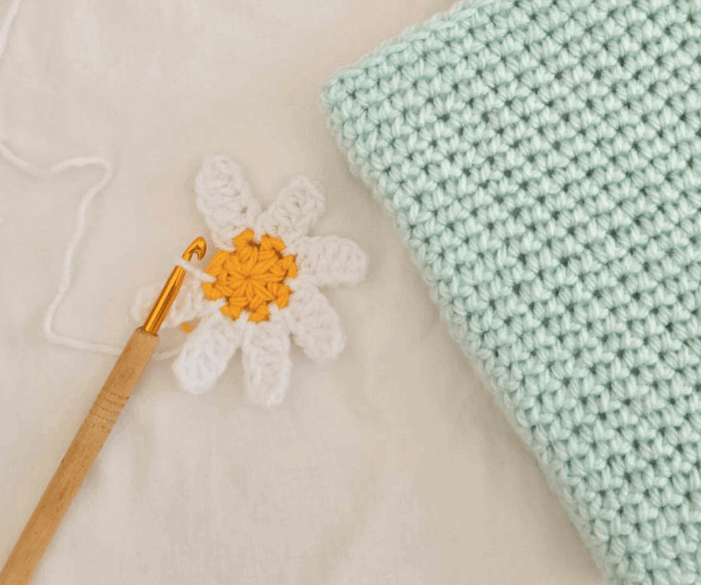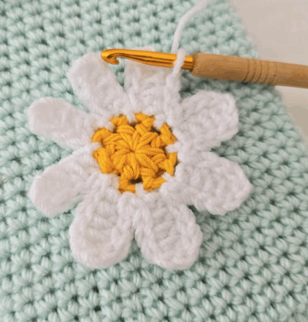 - Coloca el aplique de flor margarita sobre la funda y cose para fijarlo.