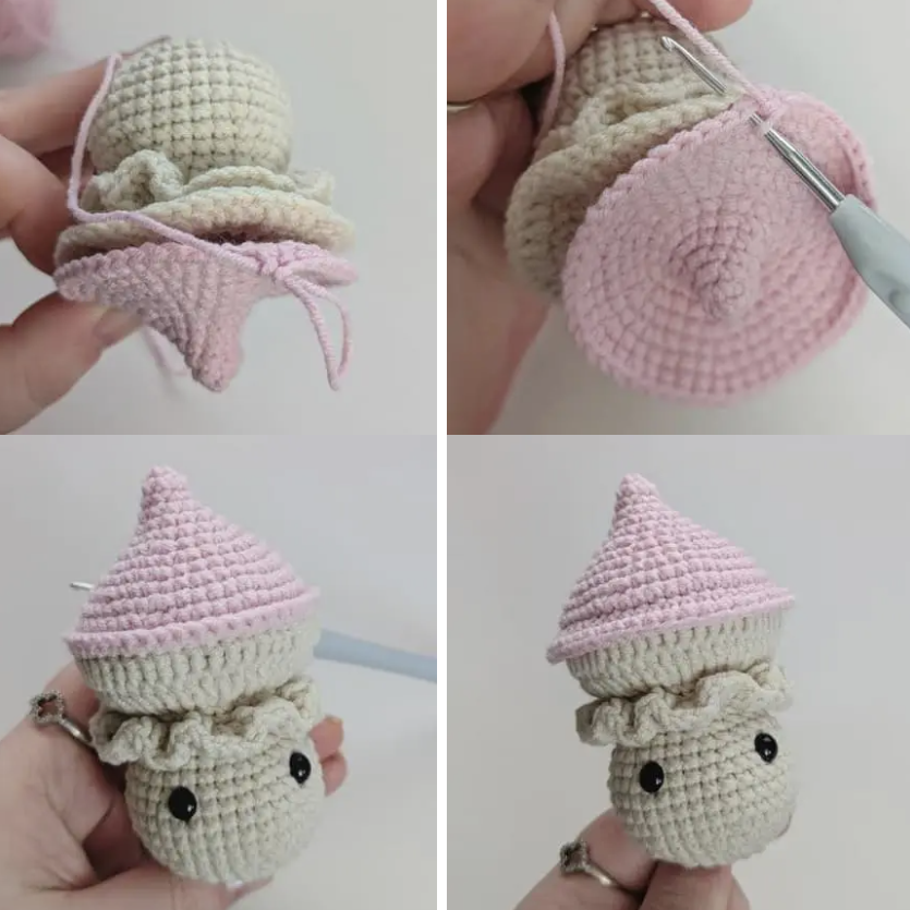 Coloca el tallo y la tapa juntos como se muestra en la imagen y teje a través de ambas partes con hilo rojo/rosa: