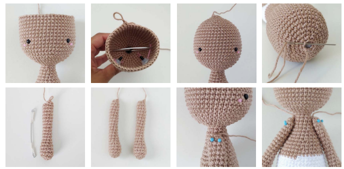 Las piernas, el cuerpo y la cabeza se tejen en una sola pieza, desde abajo hacia arriba.