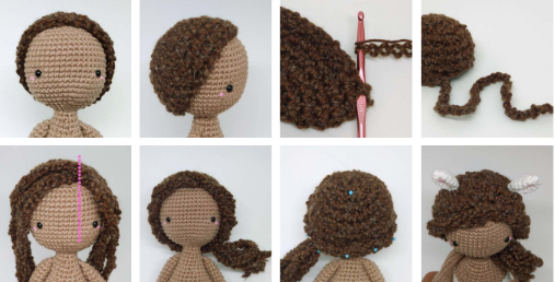 Para lograr esos rizos definidos y abundantes, teje cadenas largas y luego realiza varios puntos altos o medios puntos en cada cadena. Esto hará que el tejido se enrosque naturalmente. Al coserlos a la cabeza, hazlo en capas para darle esa apariencia de melena frondosa y suave.