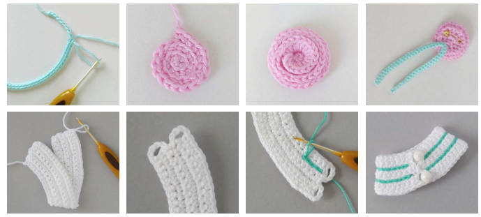 Tejer 3 flores pequeñas: 1 rosa y 2 aqua.