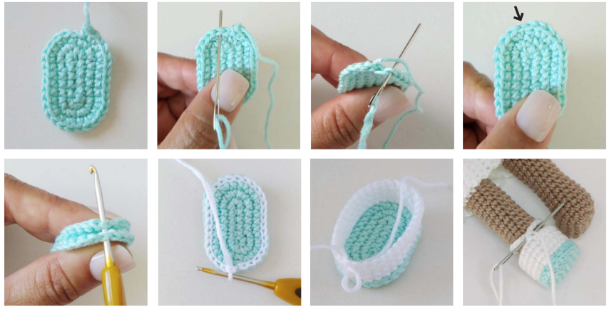 Colocar los zapatos en la muñeca y coser el extremo de la tira con su inicio para ajustar.