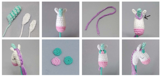 Fijar las flores a la cabeza del unicornio usando pegamento para manualidades.