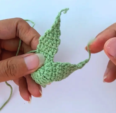 - R1: Agrega el alambre y luego desde el 2do p del gancho, haz 1 pb, 1 mpb, 1 pa, 2 varetas en el siguiente p, 1 vareta, 2 varetas en el siguiente p, 1 pa, 1 mpb, 3 pb en el mismo p, 1 mpb, 1 pa, 2 varetas en el siguiente p, 1 vareta, 2 varetas en el siguiente p, 1 pa, 1 mpb y 1 pb. 1 pr, 1 cad
