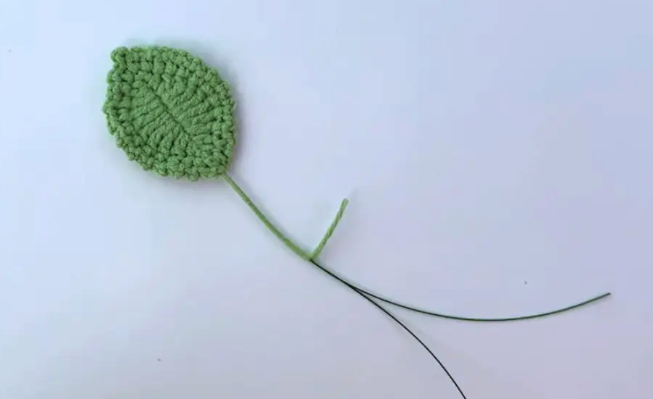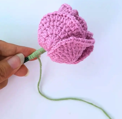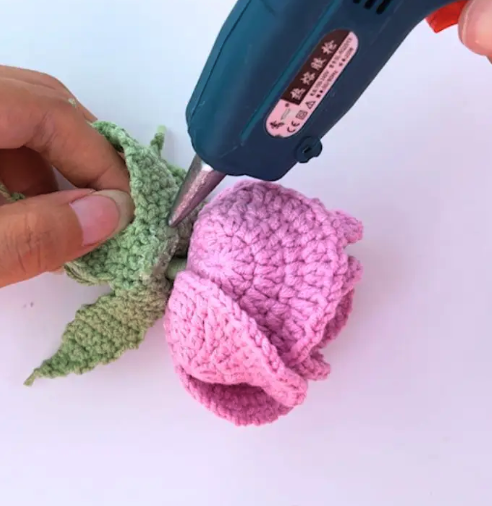 - Paso 5: Añade la parte inferior (sépalo) de la rosa Floyd tejida a crochet debajo de la rosa. Usa adhesivo termofusible para fijarla.