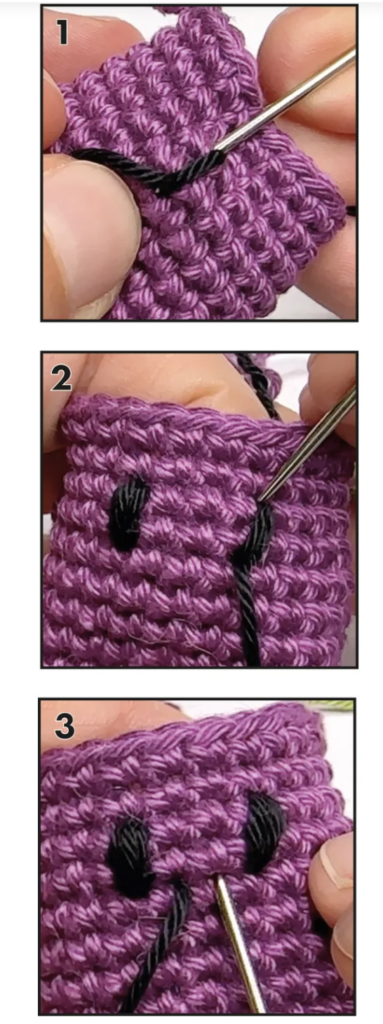 Si deseas que tu berenjena tenga rostro, borda dos ojos con hilo negro entre las vueltas 14 y 15, dejando un espacio de 3 puntos entre ellos.
