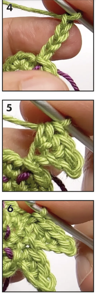 Vta 7: (pd en el siguiente p, cad 4, comenzando en la segunda cad desde el ganchillo: pd en el siguiente p, pb en el siguiente p, mpa en el siguiente p, pd en el siguiente p) repetir 9 veces (45)