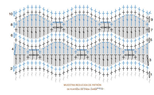7 pts y 5.75 filas = 10 cm en Long Wave Stitch