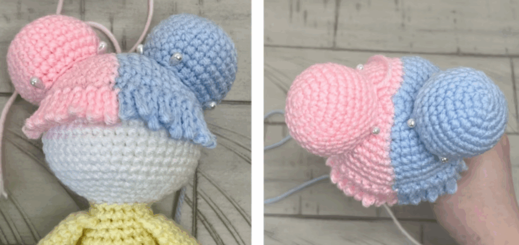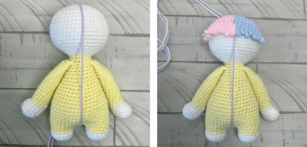 - Cose el gorro de pelo, cuidando que el cambio de color quede justo en el centro de la cabeza. Recomiendo usar un hilo largo para marcar el medio de la cabeza y el cuerpo, así es más fácil alinear todo correctamente.