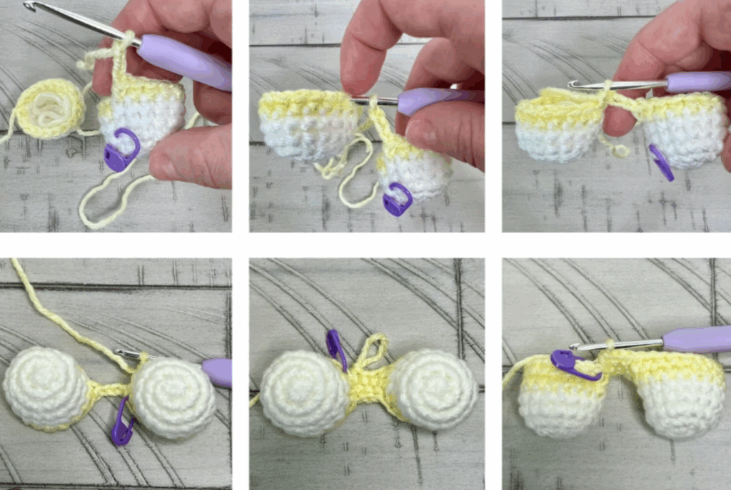 Vuelta 7: 3 cad, une con pb a la primera pierna, teje pb alrededor, luego teje 3 pb sobre las cadenas, teje pb alrededor de la segunda pierna y finalmente 3 pb sobre las cadenas del otro lado. Ahora ambas piernas quedan unidas en una sola vuelta. (42)