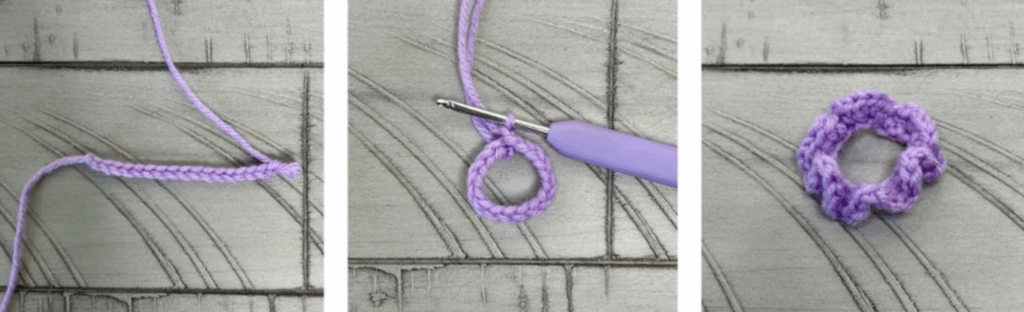 Vuelta 1: unir con pr al primer punto de cad para formar un anillo, cad 1, colocar 3 pb en cada espacio de cad alrededor, cerrar con pr en el primer punto [48]