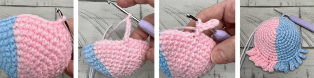 Para hacer los flecos: (pr en el siguiente punto, cad 5, en la 2ª cad desde el gancho, pr a lo largo de la cadena) repetir. Hacer 8 hebras rosas y 8 azules.