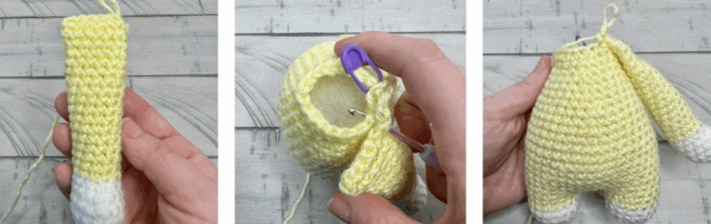 Rellena solo ¾ del brazo. Luego, presiona la abertura y teje pb a través de ambos lados para cerrarla.
