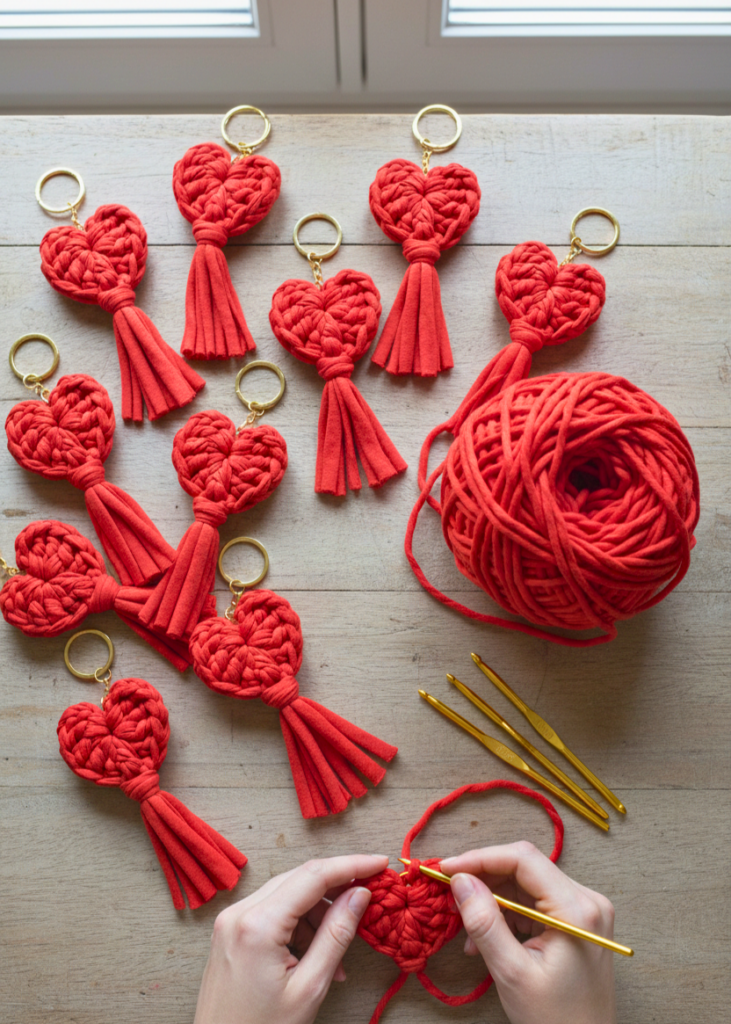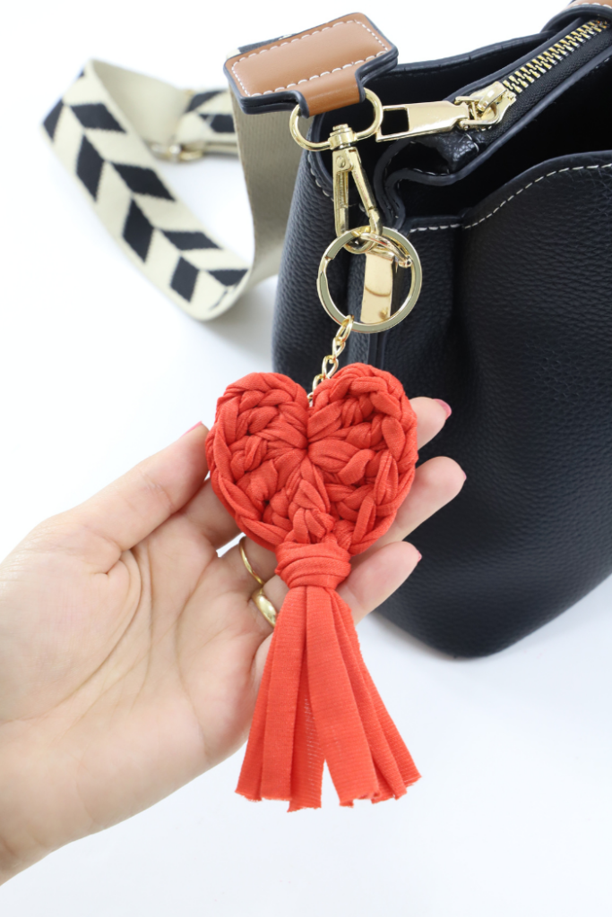 La gran ventaja de este llavero es su capacidad para transformar objetos cotidianos en piezas personalizadas 👜🔑. Es el complemento ideal para colgar en tu bolso favorito, como se ve en las imágenes, dándole un toque de color y textura instantáneo, o para organizar tus llaves con un toque de calidez. Debido a que es un proyecto que puedes tejer en apenas unos minutos, es el regalo ideal para repartir amor masivamente en San Valentín, vender en ferias artesanales o incluso usar como identificador de maletas con mucha personalidad. 🎁✨