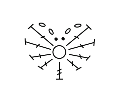 Vuelta Única Dentro del anillo mágico, teje la siguiente secuencia: 1 pr, 2 cad. 3 pad (puntos altos dobles). 3 pa (puntos altos). 1 cad, 1 pad, 1 cad. 3 pa, 3 pad. 2 cad y termina con 1 pr.