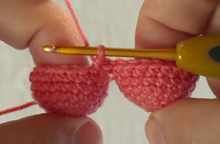7. Con pieza 2 en el ganchillo, unir a pieza 1 con 1 mp.