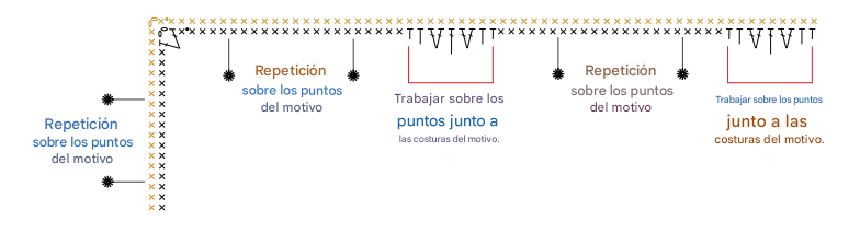 - 1.ª vuelta: *en la esquina de la manta, tejer 1 pb, 1 pa, 2 cad, 1 pa y 1 pb en el mismo punto base. Tejer todo el lateral de la manta de la siguiente manera: sobre el lateral del motivo, tejer 1 pb por cada punto base, dejando los 2 últimos puntos sin tejer. En los puntos junto a la costura, tejer 2 mpa sobre los 2 últimos puntos del motivo, 2 pa sobre la cad de la esquina, 1 pa sobre la costura, 2 pa sobre la cad de la esquina del siguiente motivo, 2 mpa. Tejer así hasta la siguiente esquina. *repetir de *a* recorriendo toda la pieza. Cerrar con un pr. Retirar la hebra.