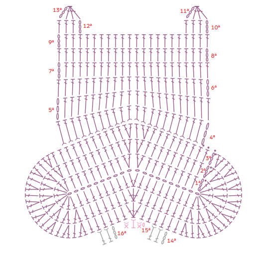 Fila 2: 3 cad, 9 pb, 2 aum de pb, 9 pb, 8 aum de pb, 7 pb, 3 pb juntos, 7 pb, 7 aum de pb, 1 pb en el mismo punto base de la cad inicial, cerrar con pbx