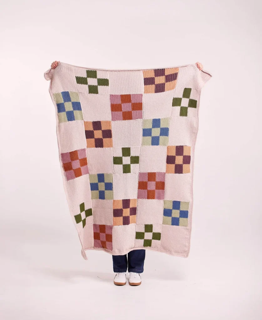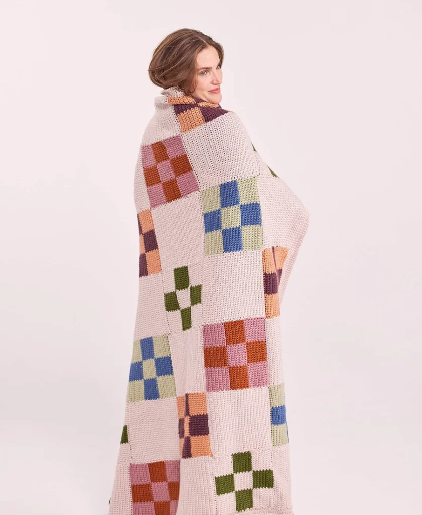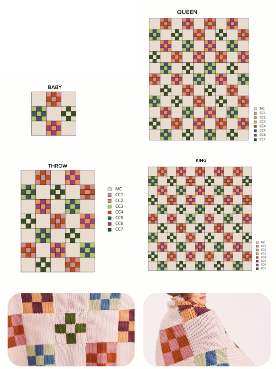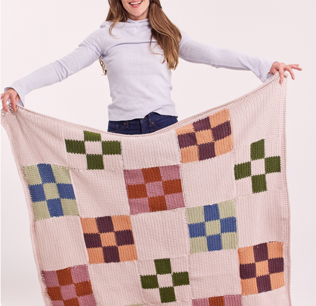 Esta manta está formada por cuadrados “9 Patch” y cuadrados lisos que se unen entre sí. Los cuadrados 9 Patch se trabajan con la técnica de intarsia para cambiar de color. Cuando cambies de un color a otro, trabaja hasta el último paso del punto y termina con el nuevo color. Utiliza una hebra independiente para cada sección dentro de un cuadrado 9 Patch. Una vez ensambladas todas las piezas, se añade un borde alrededor.