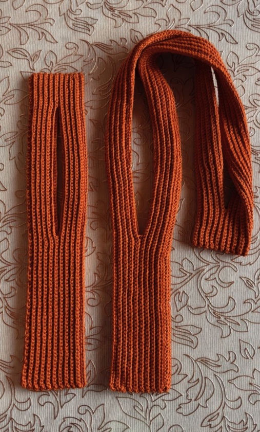 En la vuelta 11, tejer 44 pb acanalados, luego 44 cad, saltar 44 puntos de la vuelta anterior y terminar la vuelta con 12 pb acanalados.