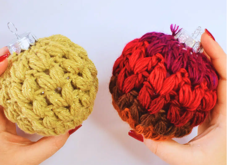 - Los adornos para árbol de Navidad en punto puff de crochet se tejen en vueltas continuas.