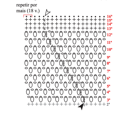 Vuelta 3 a Vuelta 16: Repite el motivo del punto fantasía B de manera uniforme, manteniendo la forma del bolso hasta alcanzar la altura deseada.