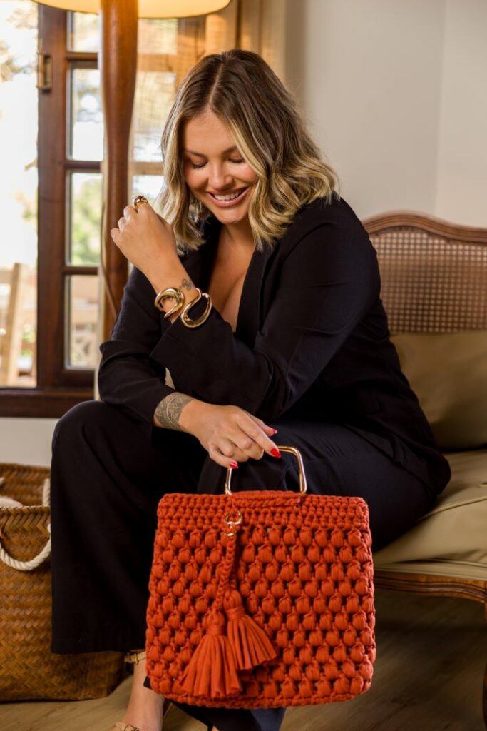 La Bolsa Jaspe es la máxima expresión de cómo el crochet puede competir con la alta moda contemporánea 👜✨. Este diseño se define por el uso del punto puff o punto garbanzo, que crea una superficie acolchada, rítmica y sumamente agradable al tacto. Su vibrante color terracota y la incorporación de asas metálicas circulares le otorgan una estructura firme y un aire profesional, mientras que las borlas XL añaden ese toque de movimiento y sofisticación artesanal que la hace destacar en cualquier lugar.