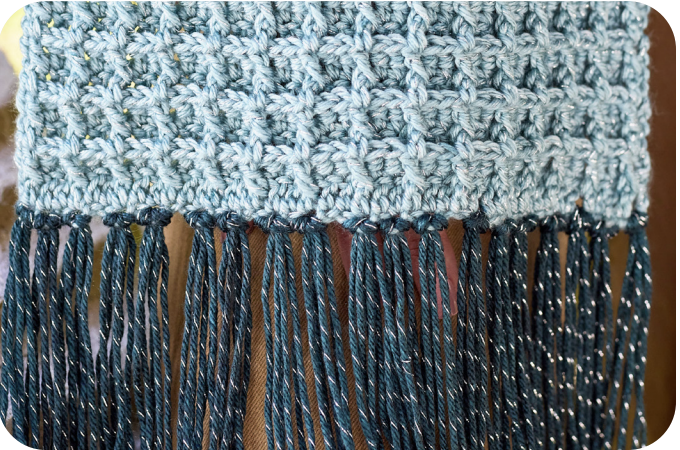 - Sujetando 2 hebras juntas, añade los flecos de manera uniforme en cada extremo de la bufanda, aproximadamente en uno de cada dos puntos.
