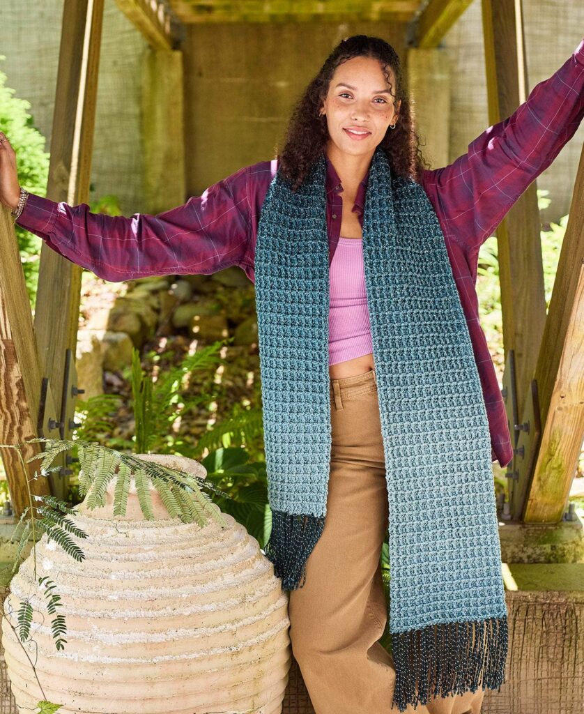 Y para complementar, te presentamos la Bufanda Andrómeda, un accesorio verdaderamente unisex y único. Tejida con el fabuloso punto gofre, esta bufanda ofrece una textura rica y un volumen acogedor que te mantendrá cálido con estilo. Lo más destacado es su vibrante degradado de color, que evoca las nebulosas del espacio, dándole un toque moderno y misterioso. Es un proyecto ideal para practicar puntos texturizados y crear una pieza que se adapta a cualquier persona y estilo.