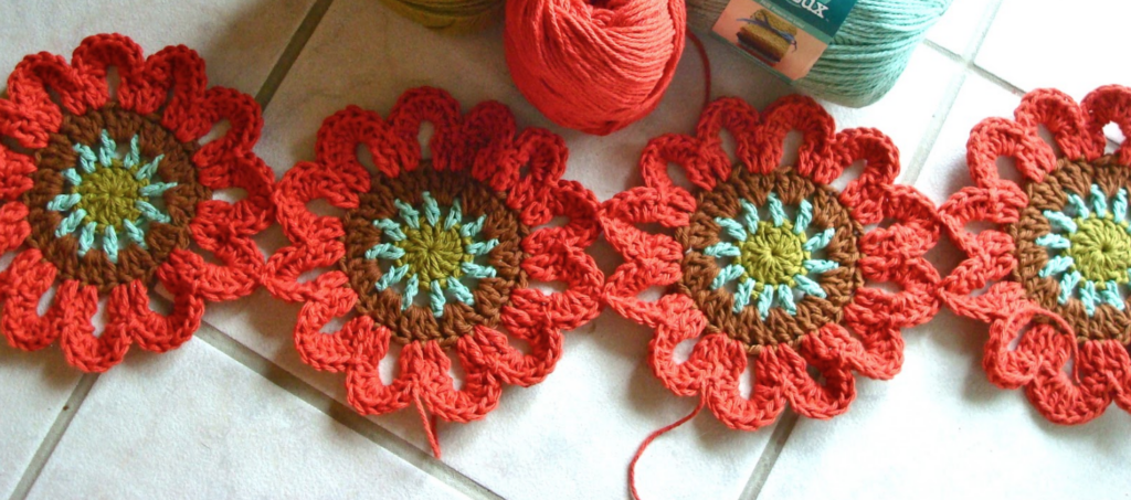 Primero se colocan las 7 flores completas y luego se agregan las medias flores en cada extremo usando el método de unir mientras se teje.