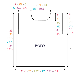 Teje igual que la espalda hasta el inicio de la sisa. Continúa recto hasta que la sisa mida 7.5 (7.5-9-9-10-11.5) cm menos que la espalda antes de los hombros, terminando en una F2 o F8.
